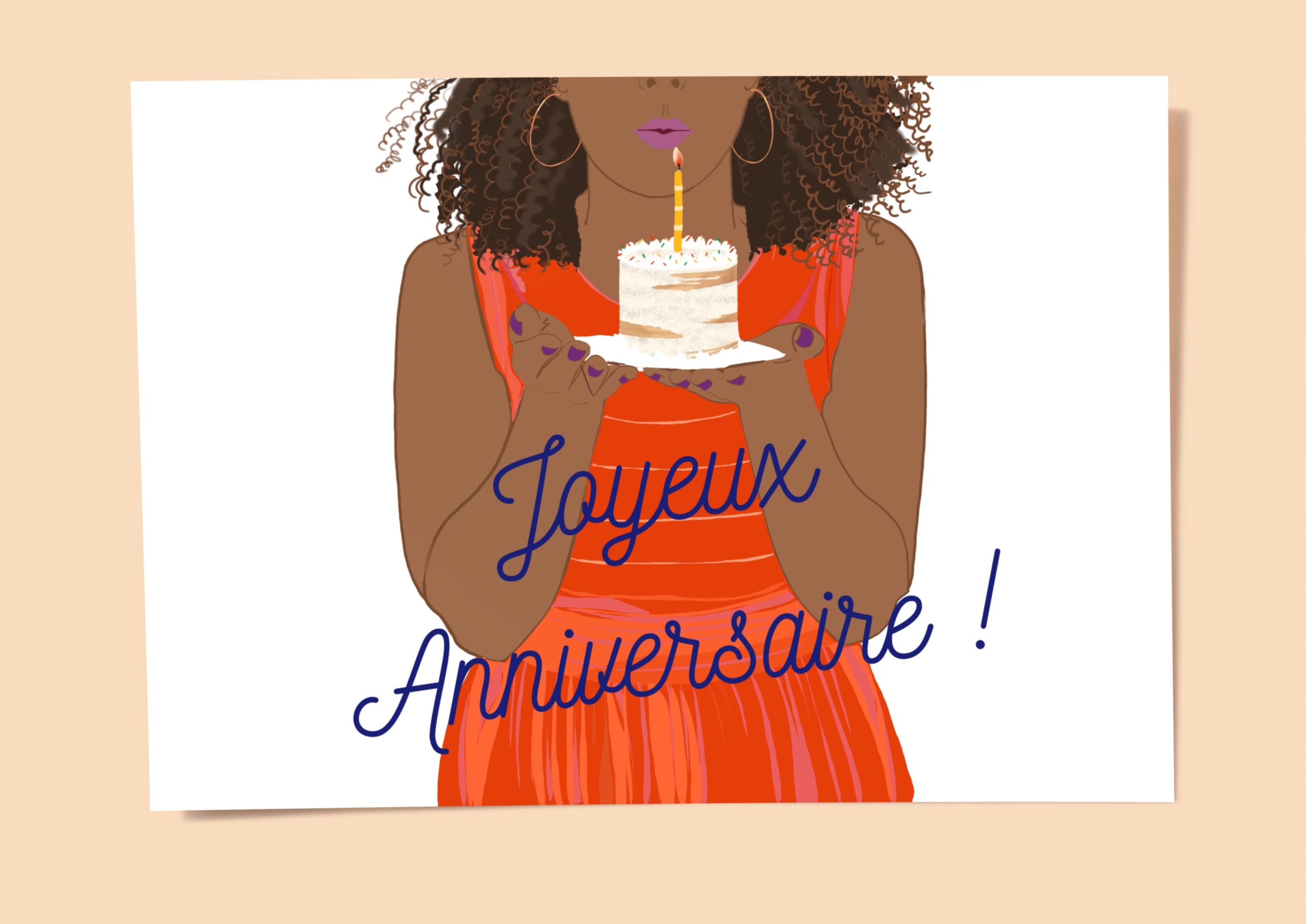 Cette illustration met en scène une femme célébrant son anniversaire au moment de souffler sa bougie, comme un instant suspendu de poésie.