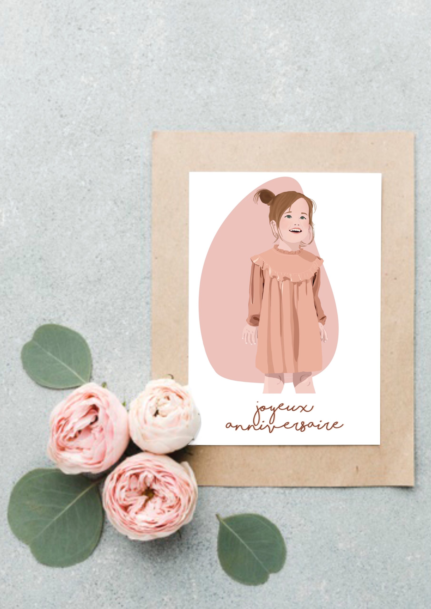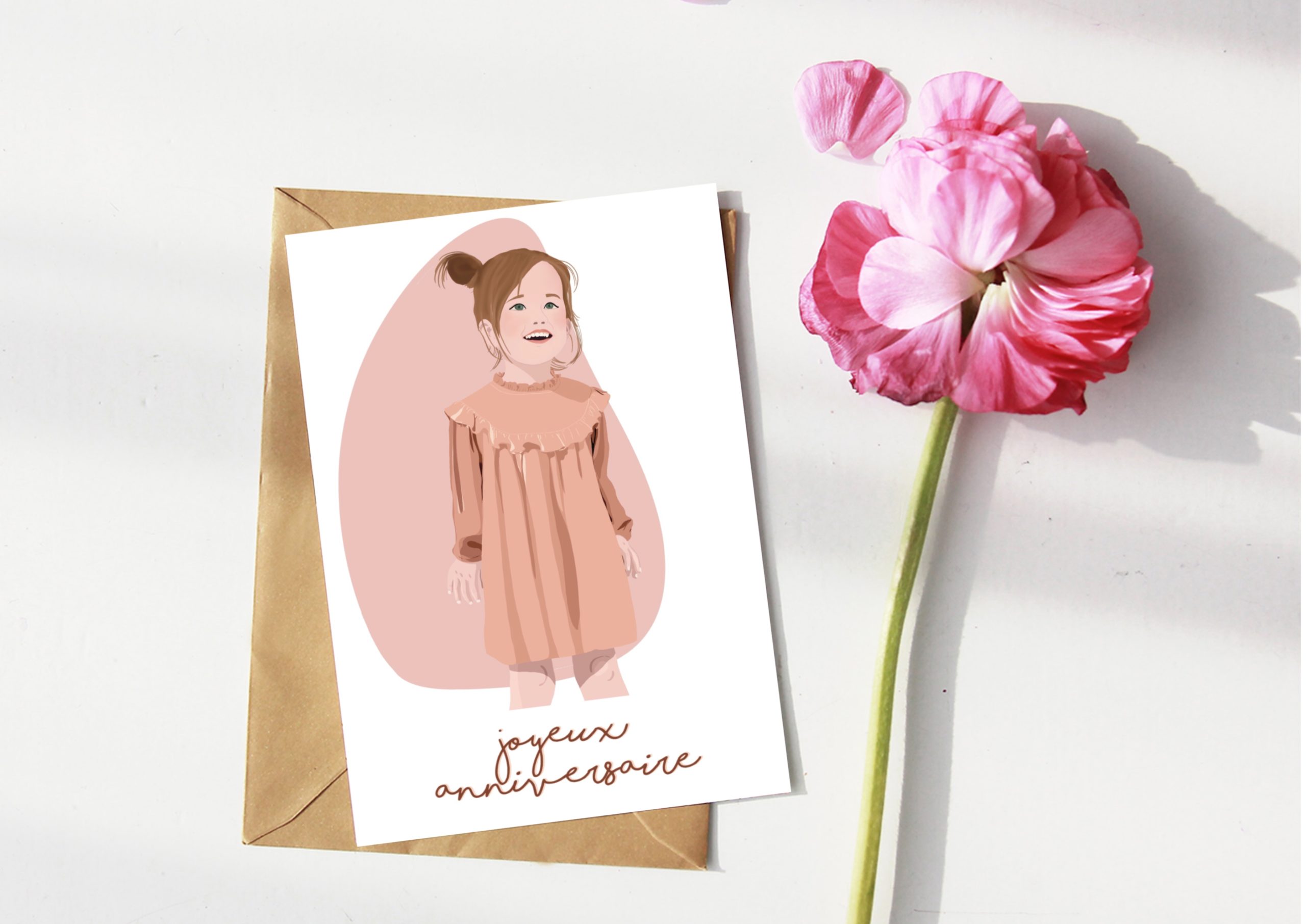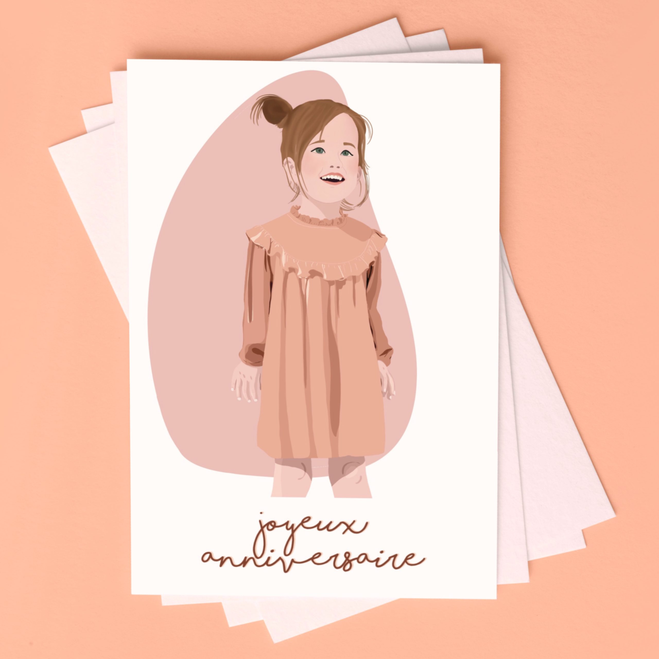 Cette illustration met en scène une petite fille souriante, vêtue d’une jolie robe rose, pour célébrer son anniversaire avec tendresse et simplicité.