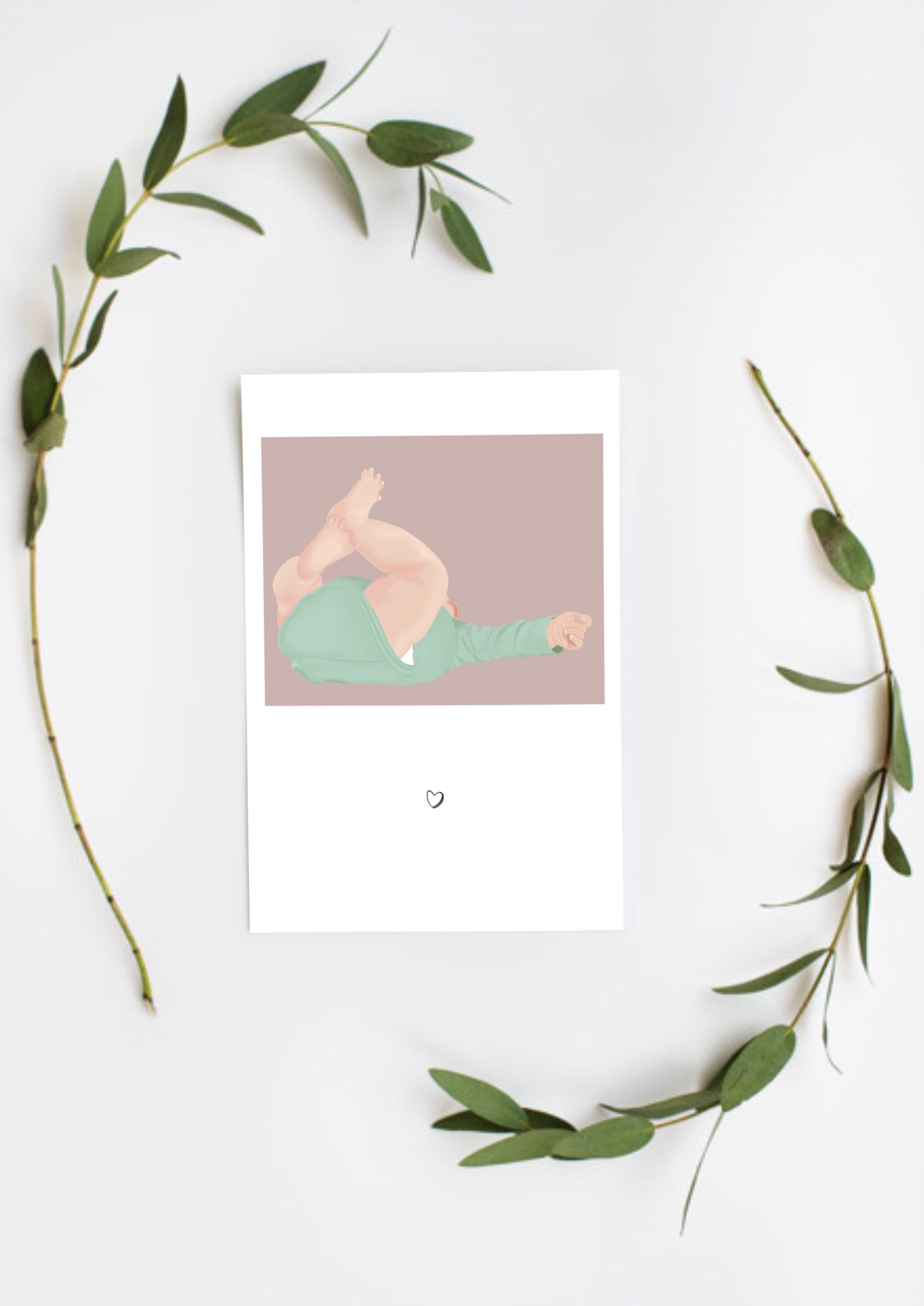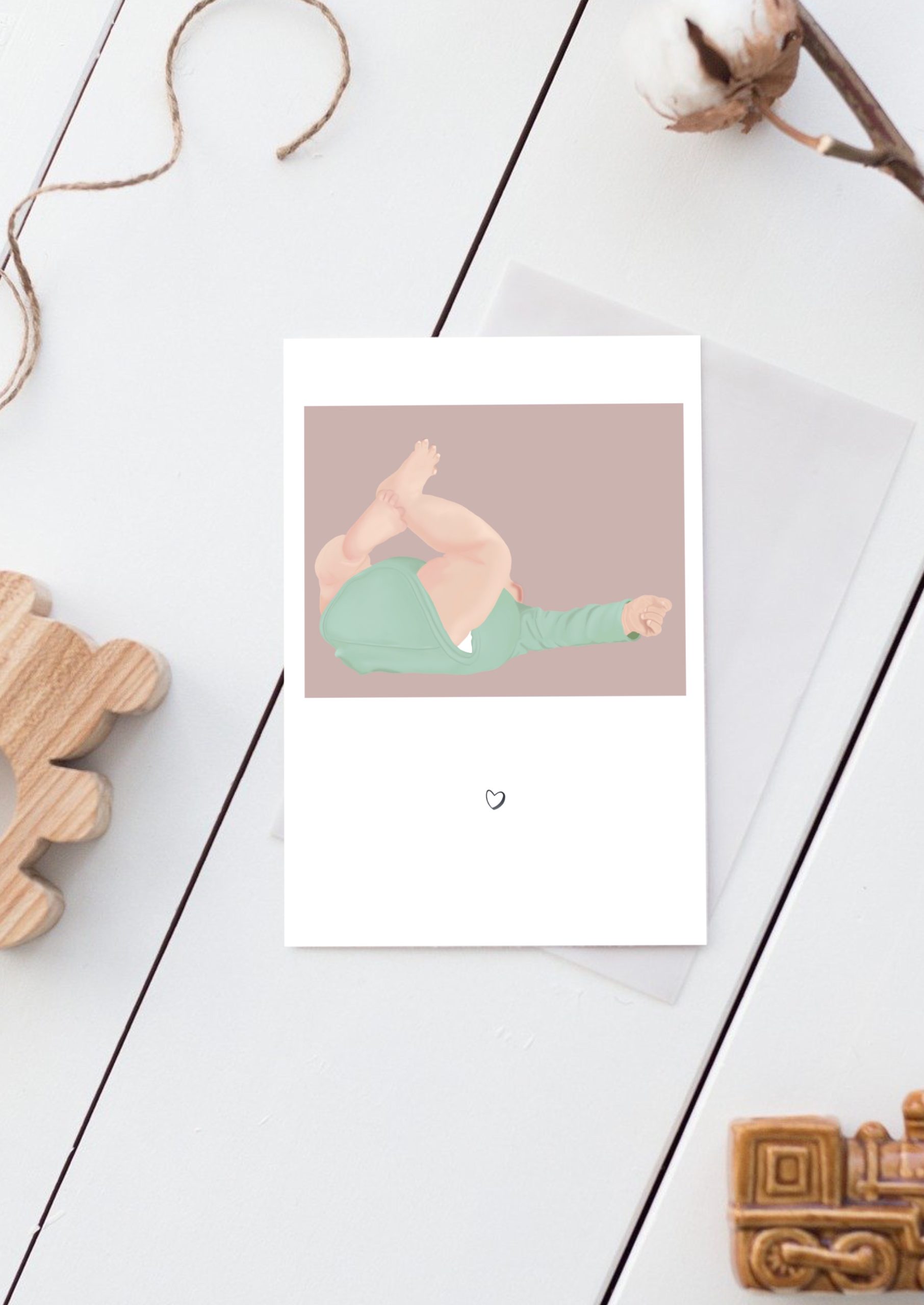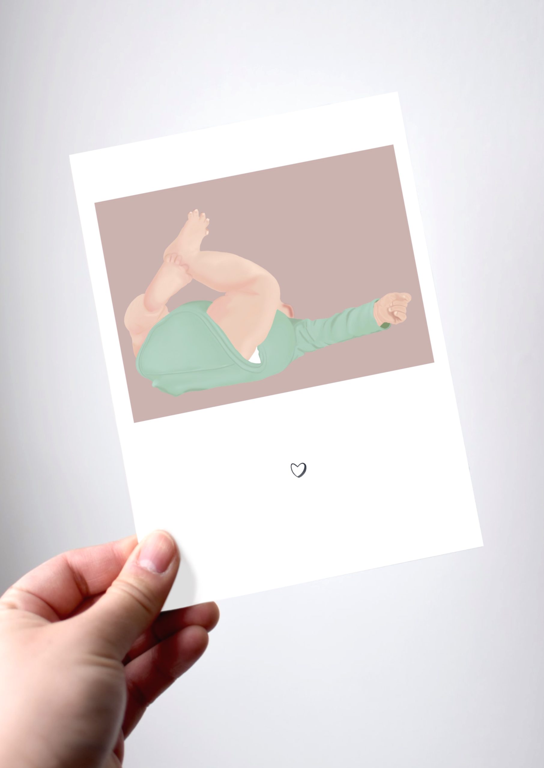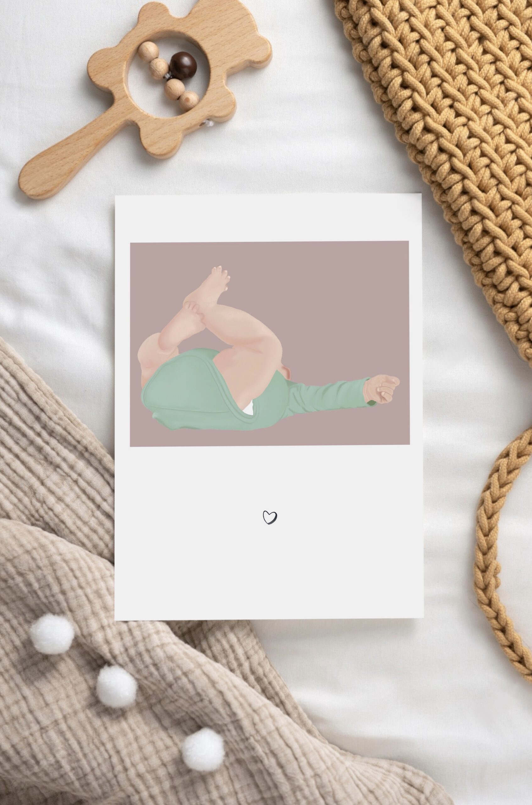 Une carte de naissance illustrée douce et délicate, représentant un petit bébé dans un moment tendre du quotidien.Une scène du quotidien qui évoque les premiers instants de vie, entre douceur et spontanéité.
