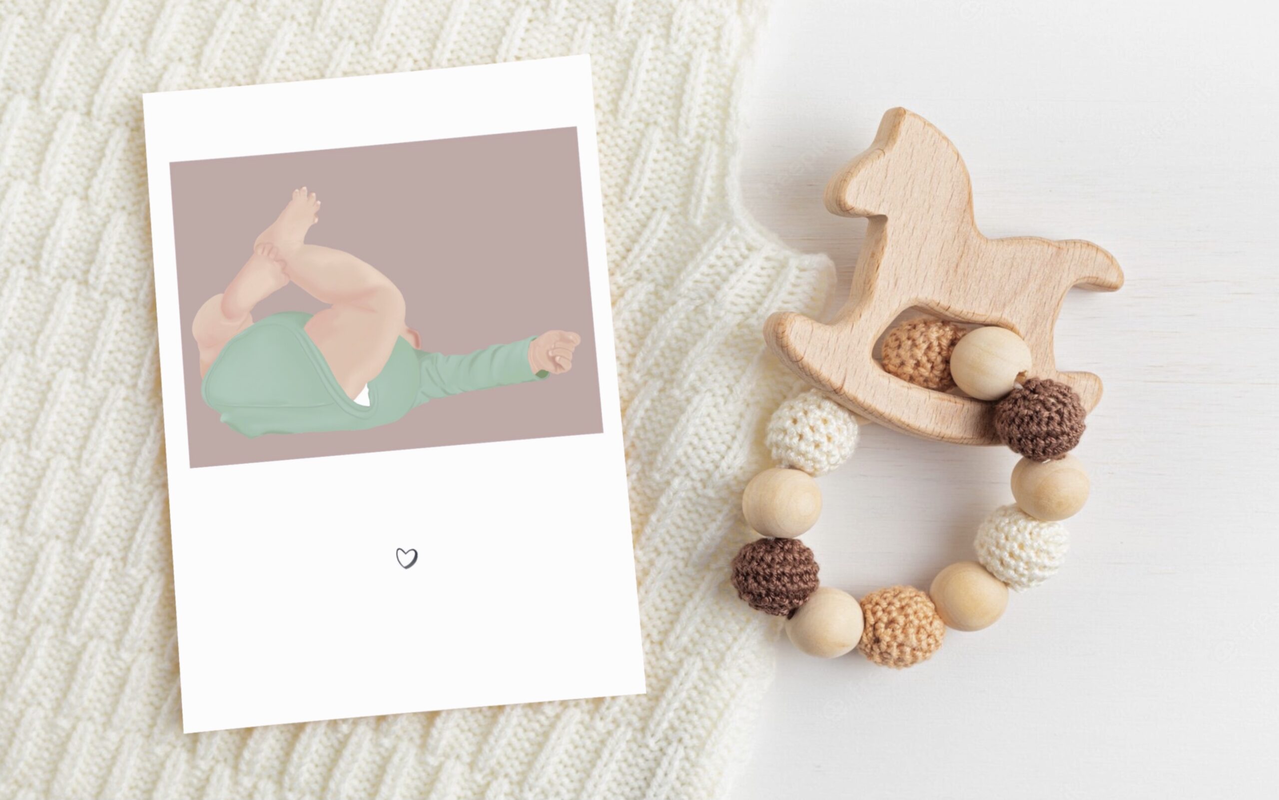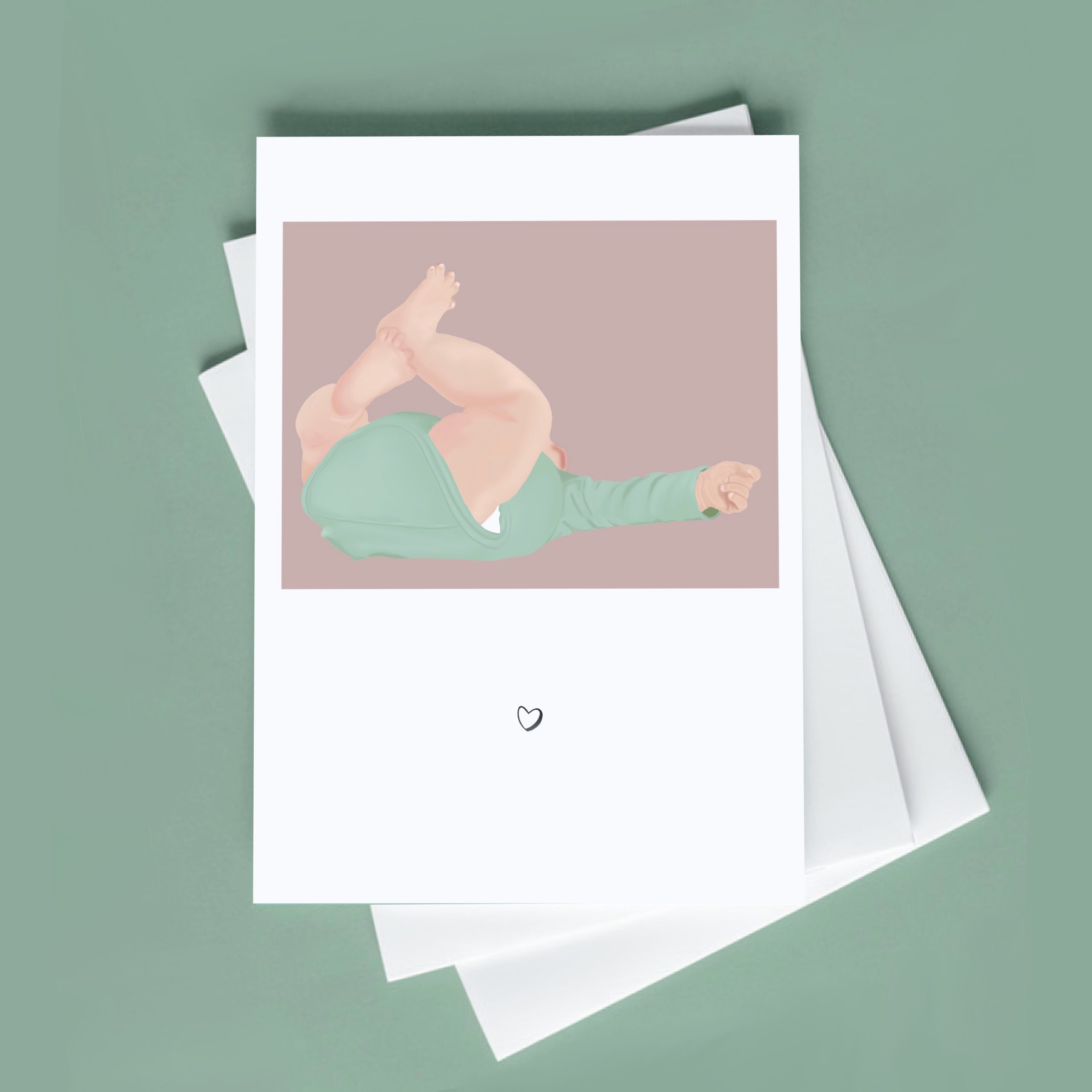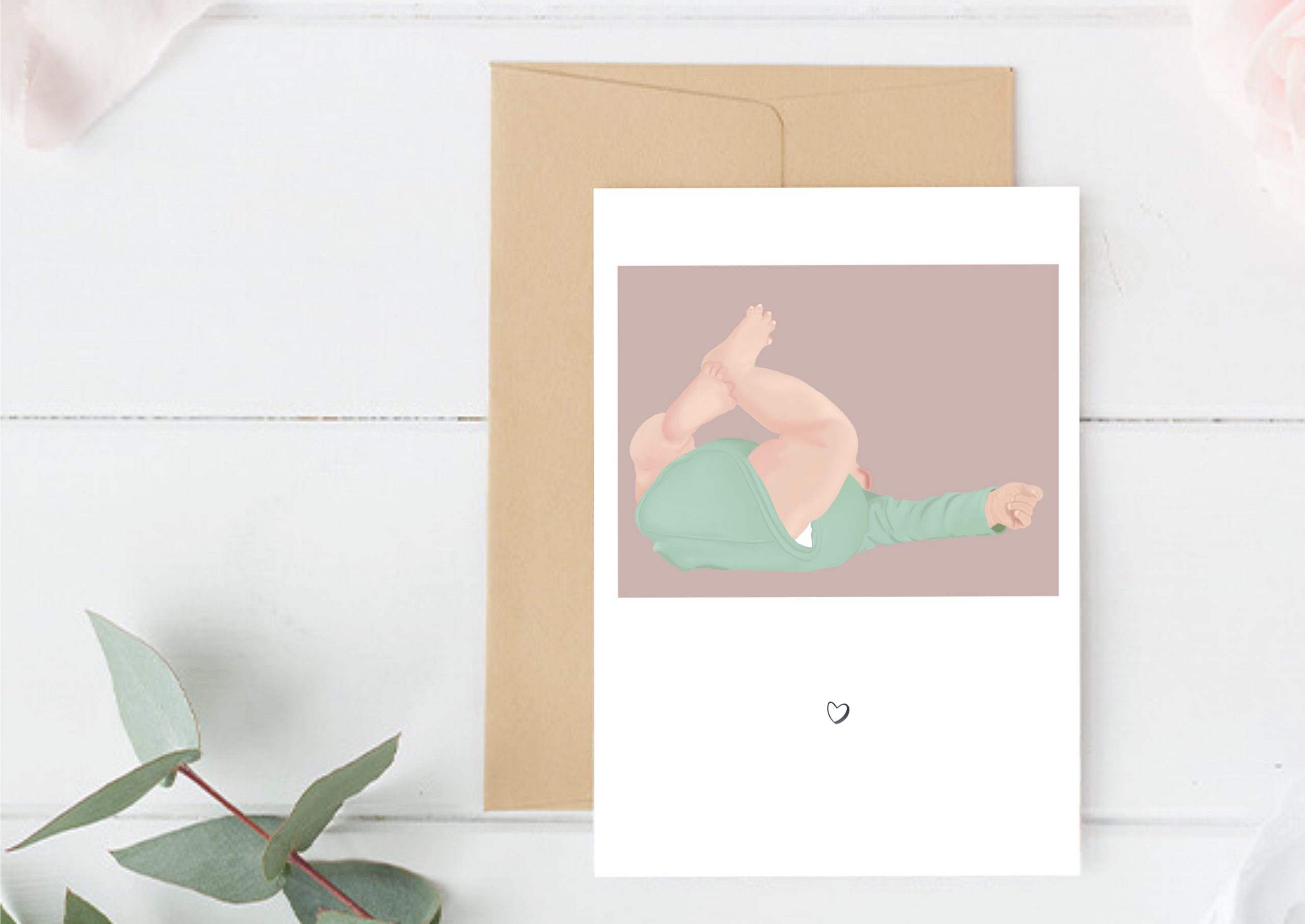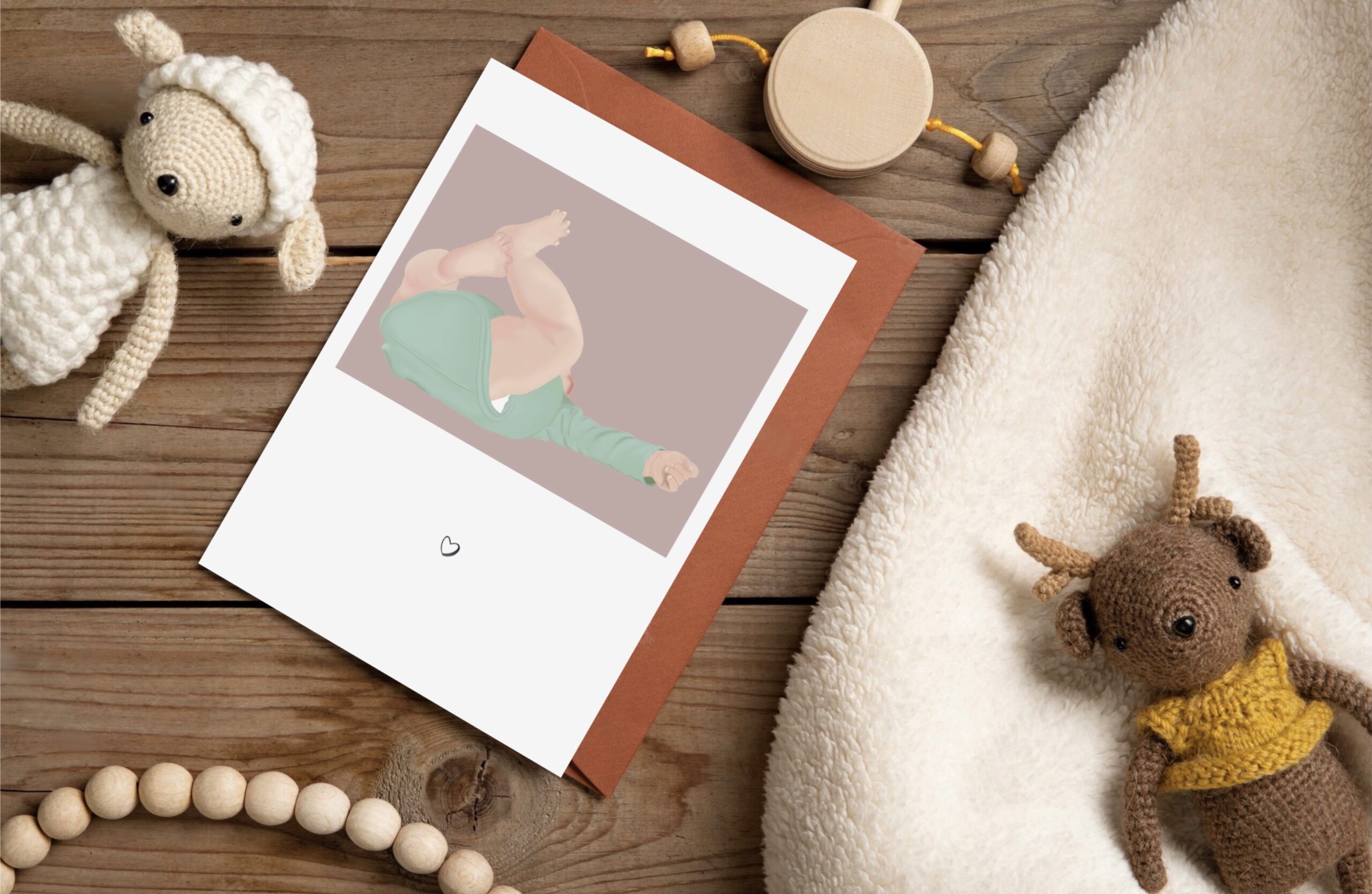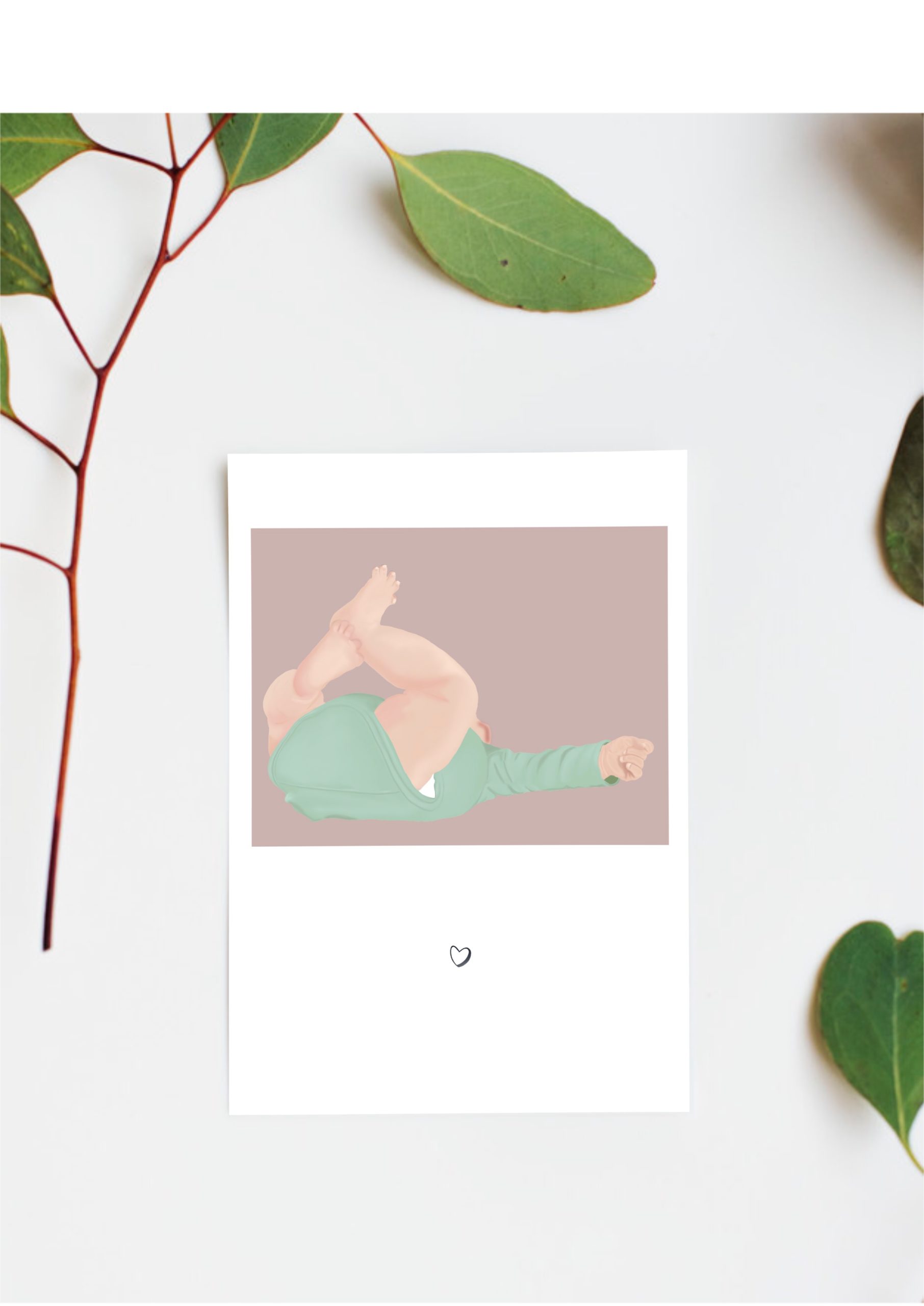 Une carte de naissance illustrée douce et délicate, représentant un petit bébé dans un moment tendre du quotidien.Une scène du quotidien qui évoque les premiers instants de vie, entre douceur et spontanéité.