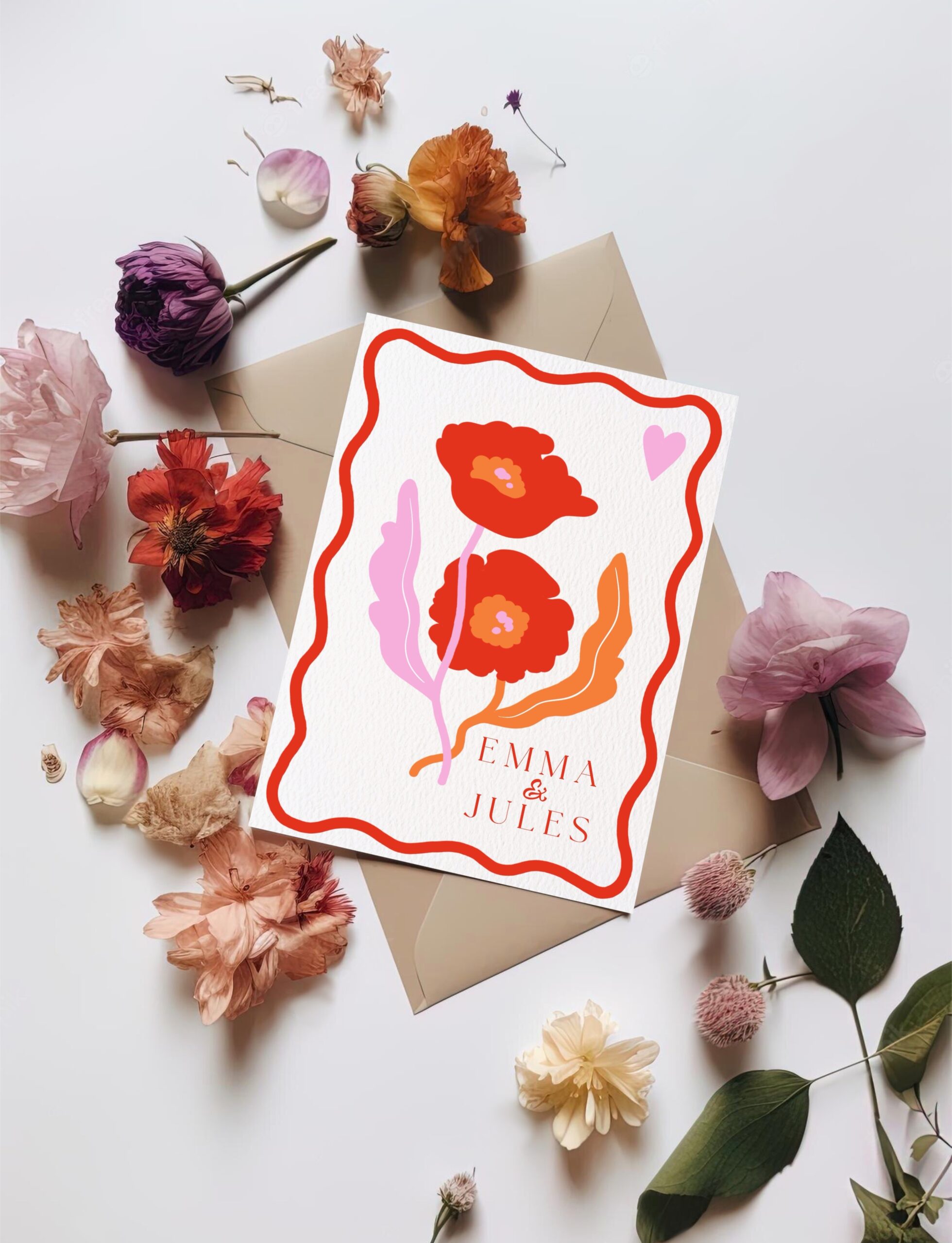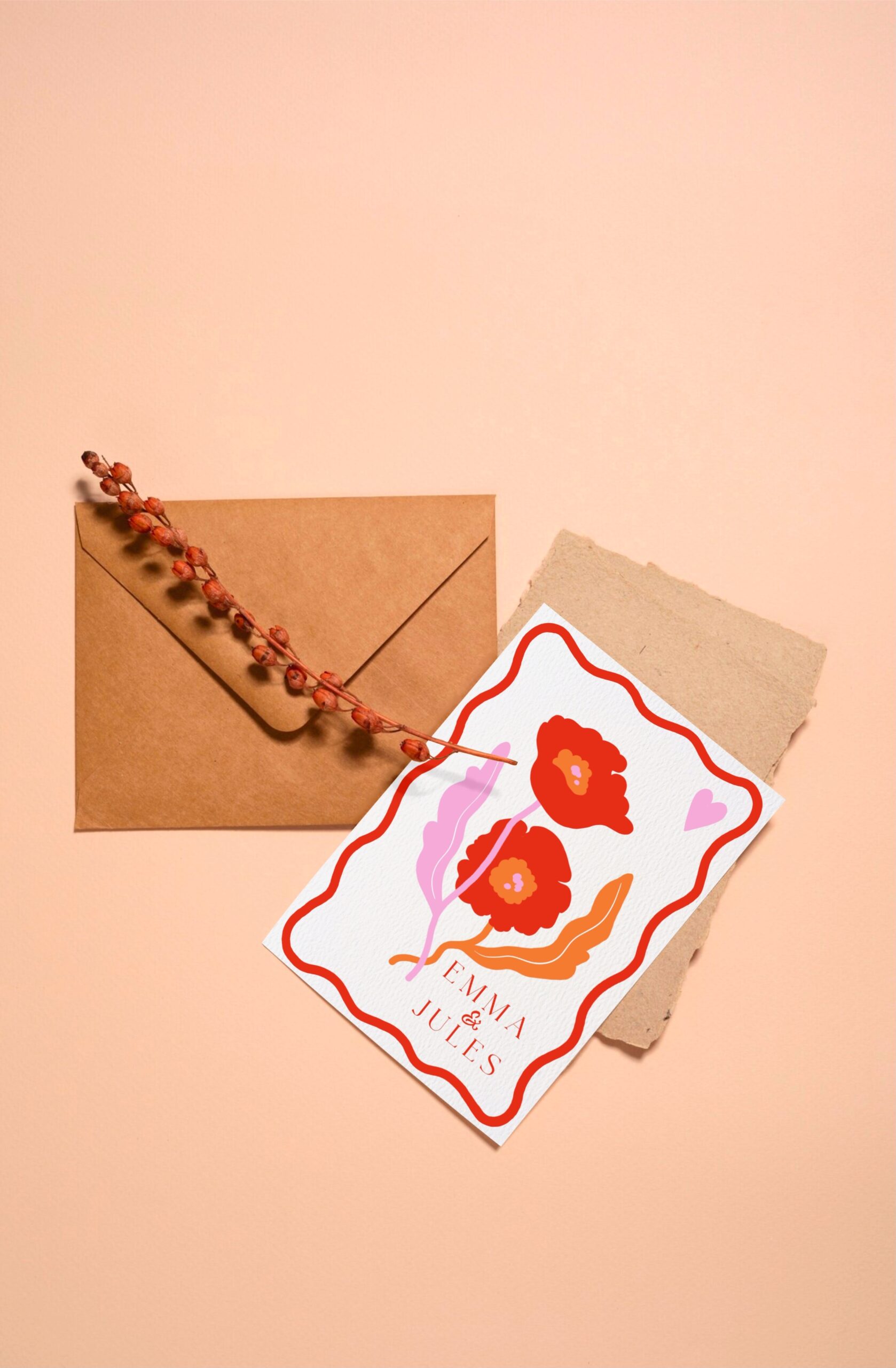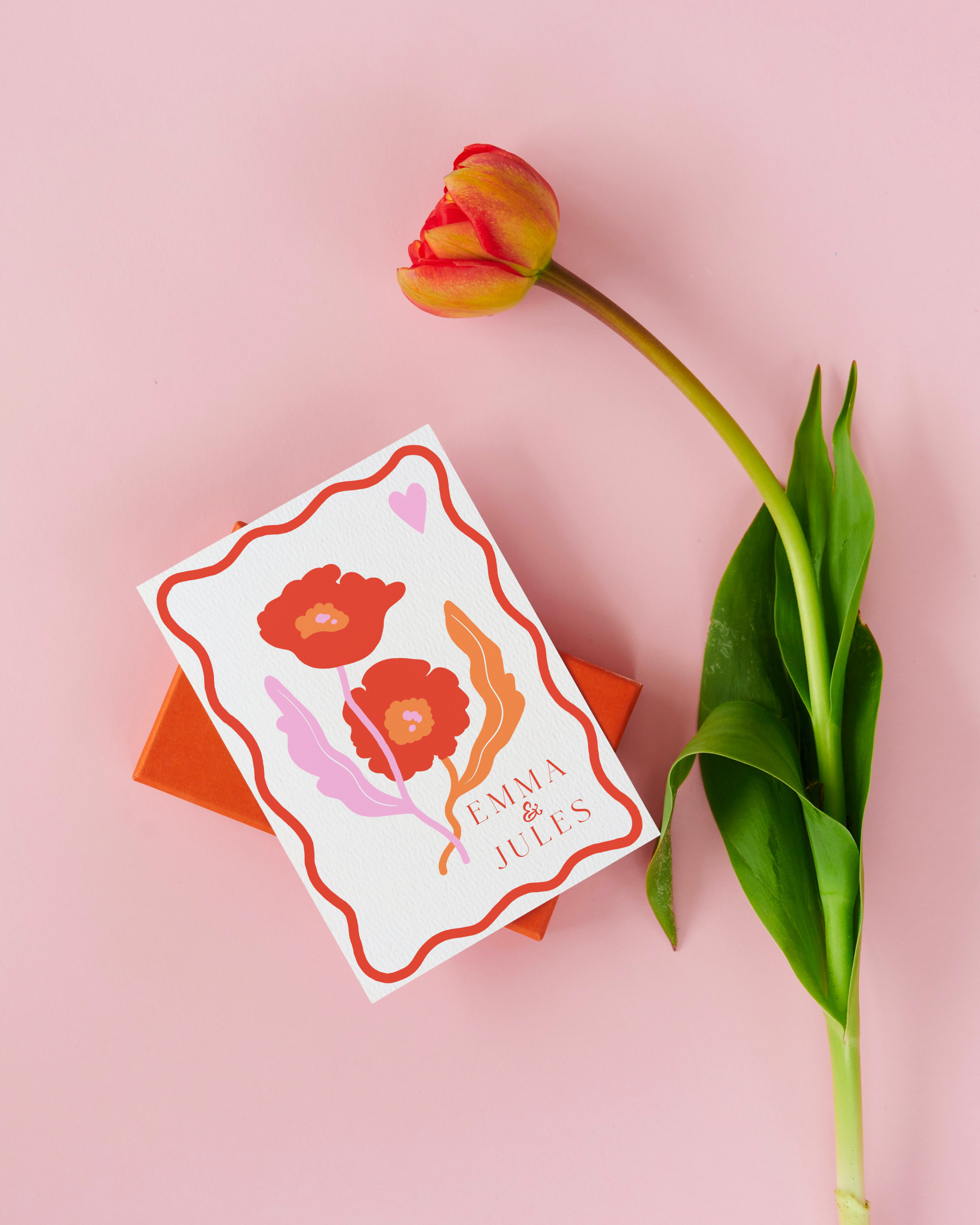 Un design résolument pop et joyeux, idéal pour les couples qui souhaitent une papeterie de mariage unique, lumineuse et pleine de personnalité.